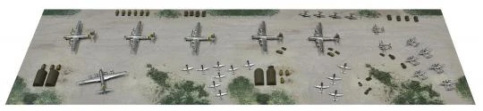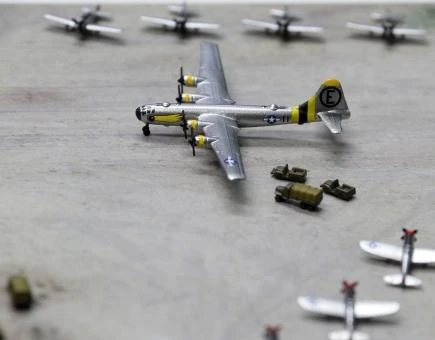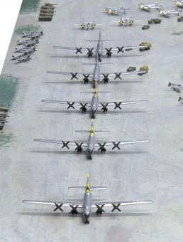 This is a plastic model set of aircraft, vehicles, and accommodations that reproduce the frontline bases of the U.S. 20th Air Force, deployed to the Mariana Islands (Guam, Saipan, Tinian, etc.) in the latter half of World War II. A paper base for the runways is also included. Simple lodgings, bulldozers and motor graders of the United States Army are in the box too![Includes]: