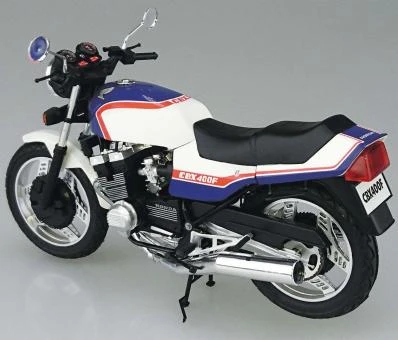 Check out the 1/12 scale Honda NC07 CBX400F Pearl Candy Blue / Pearl Shell White ’81 kit from Aoshima! It utilizes real rubber tires and vinyl piping for the wires and hoses.