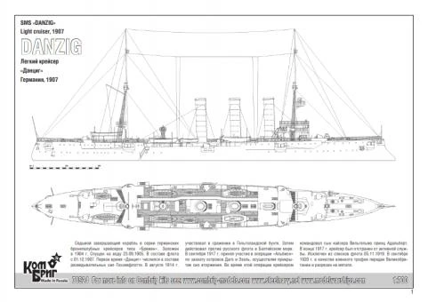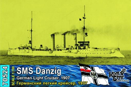 SMS Danzig was a light cruiser of the Imperial German Navy. Named for the city of Danzig (now Gdańsk, Poland), she was the seventh and last ship of the Bremen class. She was begun by the Imperial Dockyard in her namesake city in 1904, launched on 23 September 1905 and commissioned on 1 December 1907. Armed with a main battery of ten 10.5 cm (4.1 in) guns and two 45 cm (18 in) torpedo tubes, Danzig was capable of a top speed of 22 knots (41 km/h; 25 mph).